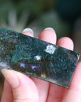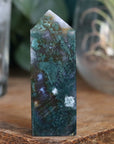 Gorgeous moss agate tower from India! Stands approx 3.05 inches tall, 1.1 inches wide and weighs 86.7 grams (3.06 oz). *Number in the title of the listing is just a way for me to identify the item.* **This piece has the slightest imperfect point as shown in the photos and is being sold at a discount.**